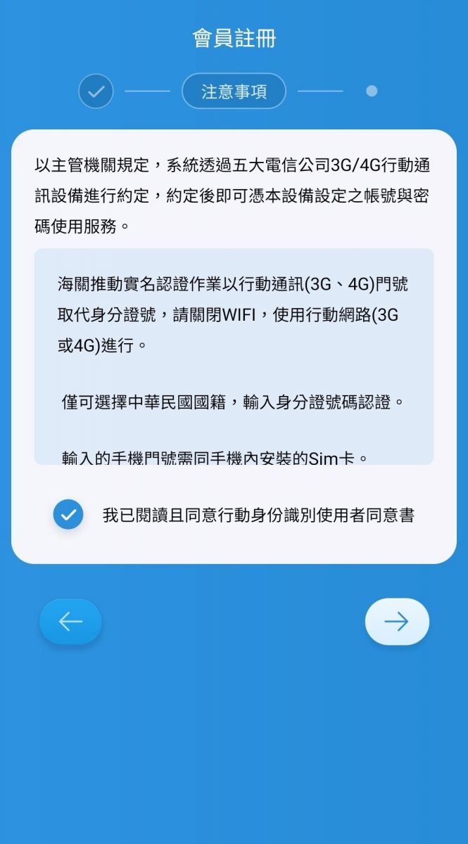 將下方[我已閱讀且同意....]項目打勾,並點箭頭進行下個步驟。