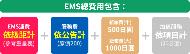 EMS運費 + 服務費(依最新公告優惠) + 紙箱費(中500日圓/大1000日圓) + 加值服務費(可選)