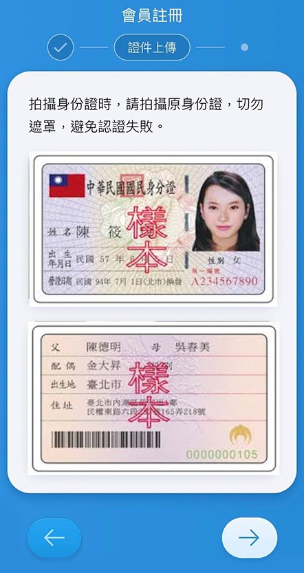 上傳證件時請點擊畫面中的「相機圖案」,並拍攝身分證正反面各一張,如下圖所示。證件照片是提供給關務署系統驗證您的身分。