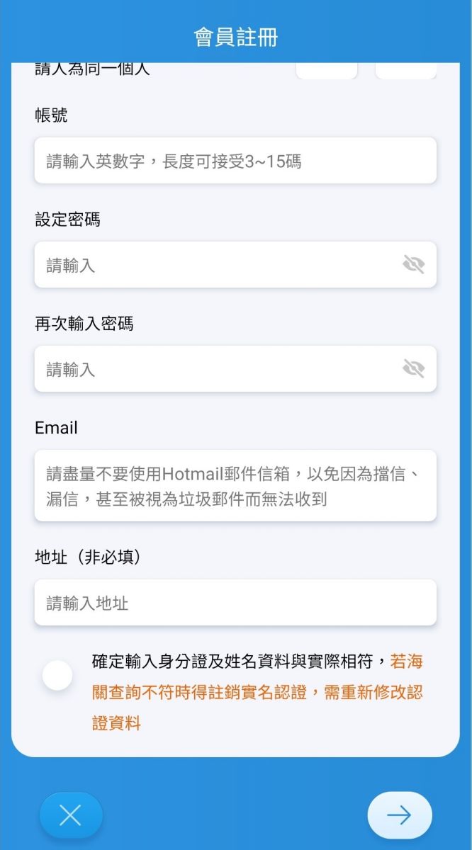 資料輸入完畢後,最下方[確定輸入資料身分證及姓名資料與實際相符] 請打勾後點選箭頭進行下一步。