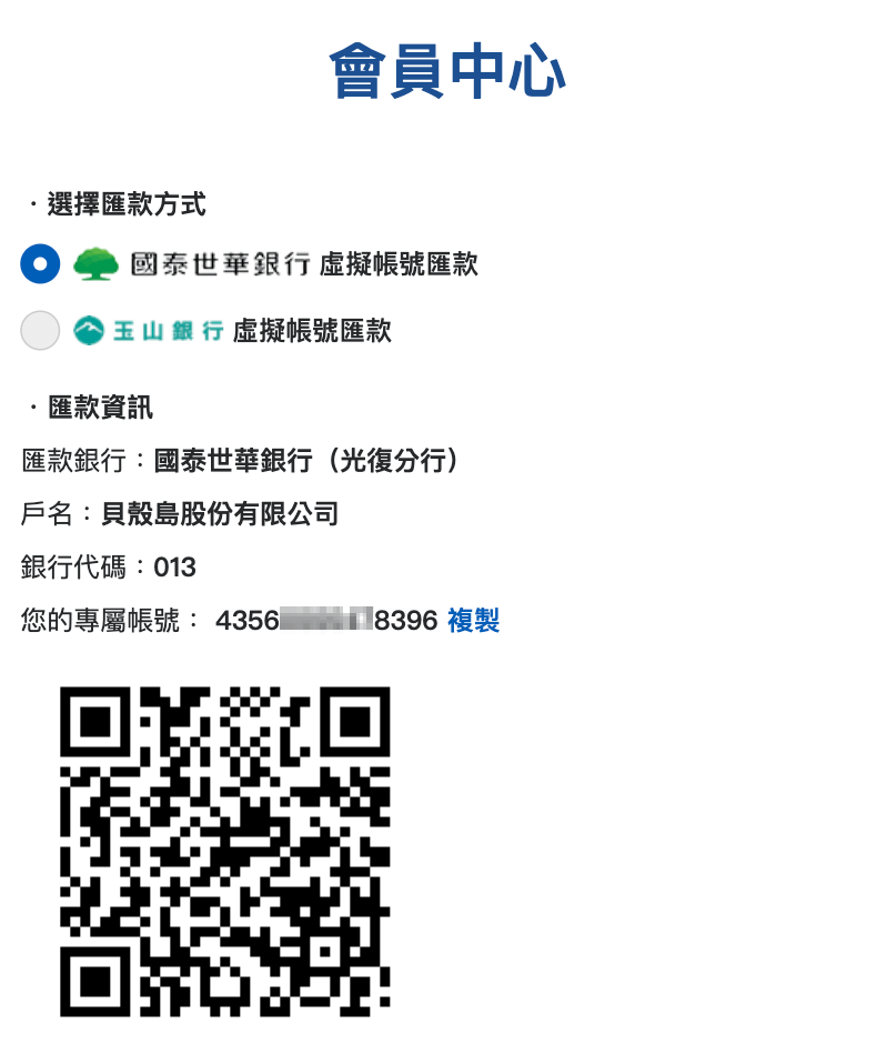 進入會員中心,選擇購物金明細分頁,就可看到您個人專用的虛擬帳戶匯款資訊,您可以使用網銀、手機APP進行轉帳。